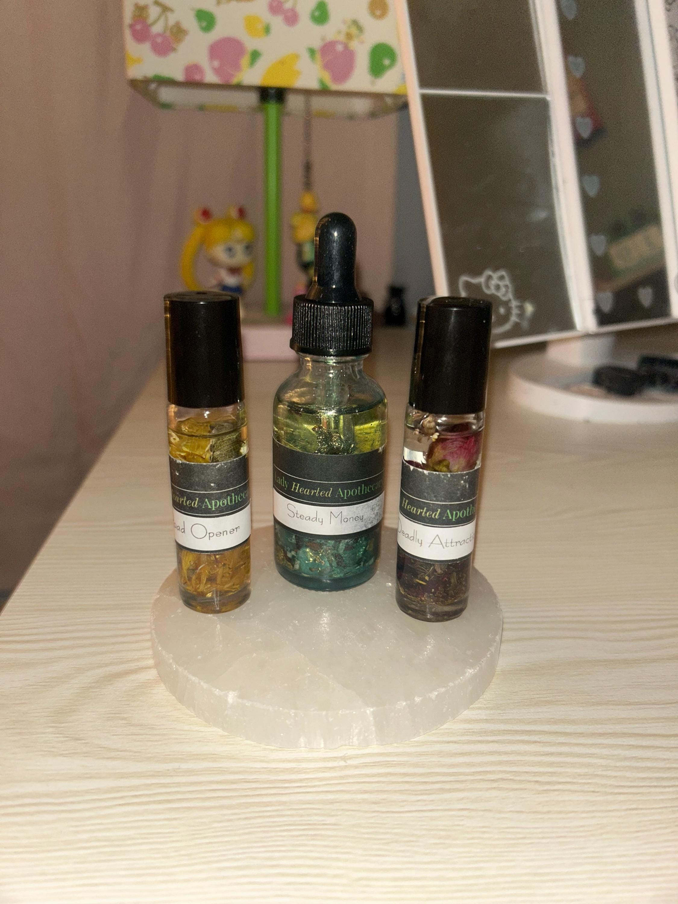 Instructions: Once you receive your oil it is best to focus your own intentions into the oil. One of the best ways to do this is dressing the candle with the oil and allowing the flame and smoke to send up your intentions. When you dress a candle, you are imprinting your intentions onto it which makes your spells more powerful and effective. For best results use the oils to anoint candles, to make floor washes, to anoint tools and objects, or add a couple of drops to a spiritual bath. I always encourage people to get creative.  Due to allergies, please do a patch test on your skin PRIOR to applying the oil like a perfume on your skin.  Since the herbs are a proprietary blend I am unable to reveal all of the herbs used in each individual oil.  If you do incur a allergic reaction, please consult a physician and discontinue topical use.